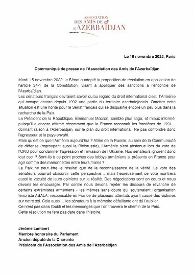 Президент Ассоциации друзей Азербайджана (ADA), бывший депутат Национального собрания Франции Жером Ламбер выразил резкое несогласие с резолюцией, принятой Сенатом Франции.
