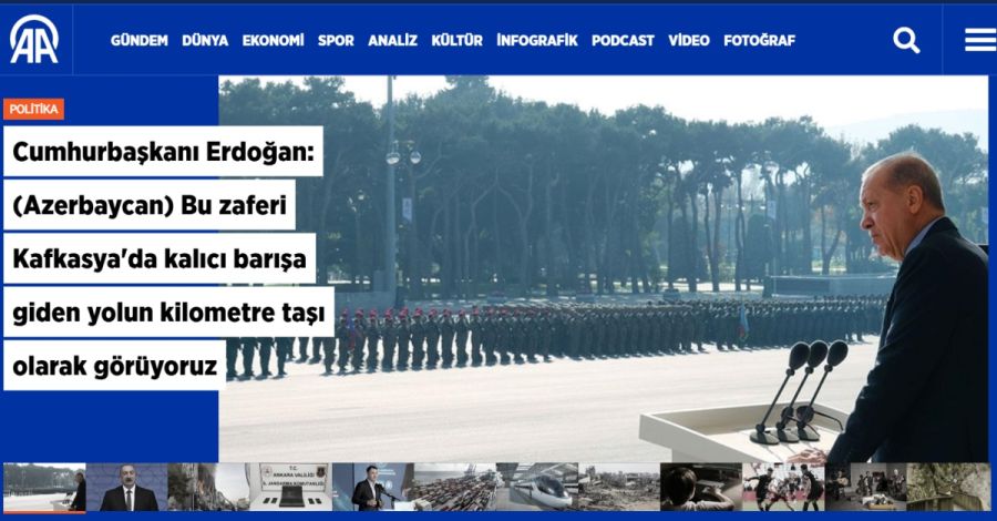 В публикациях были приведены цитаты из заявлений лидеров Турции и Азербайджана о необходимости обеспечения прочного мира и стабильности на Южном Кавказе, о тесном братском единстве Баку и Анкары, а также о развитии регионального сотрудничества. В рубрике «Главная новость» агентства Anadolu были отмечены слова Президента Ильхама Алиева о том, что заявление Президента Турции Реджепа Тайипа Эрдогана, сделанное во время Отечественной войны «Азербайджан не одинок, Турция рядом с Азербайджаном!» стали очень серьезным посланием всему миру, а также высказывание Президента Азербайджана «Азербайджанский народ никогда не забудет эту братскую поддержку», приведена цитата Президента Турции Реджепа Тайипа Эрдогана: «Воспринимаем эту победу не как завершение, а как очередной шаг на пути к долгосрочному миру на Кавказе».