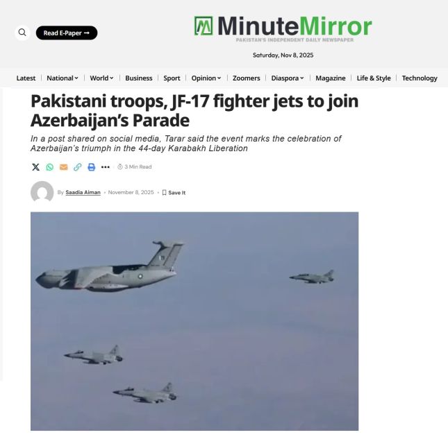 Ведущие средства массовой информации Пакистана, включая ARN News Centre, AAJ News (AAJ TV), The Express Tribune, Brecorder, Geo News, 24 Ne3ws HD и Minute Mirror, в своих публикациях сообщили о масштабности военного парада, совместном участии вооруженных сил Азербайджана, Турции и Пакистана, а также о продемонстрированной военной технике и авиации. Особое внимание было уделено выступлению Президента Азербайджанской Республики, широко освещались высказывания главы нашего государства о решительной поддержке, оказанной Турцией и Пакистаном Азербайджану в период Отечественной войны. Также отмечалось, что Президент Ильхам Алиев выразил благодарность Пакистану за оказанную твердую поддержку в справедливой борьбе Азербайджана и высоко оценил роль официального Исламабада в обеспечении региональной стабильности в Южной Азии. В публикациях особо подчеркивалось участие в параде Премьер-министра Пакистана Мухаммада Шахбаза Шарифа, внимание было обращено на тесное сотрудничество армий трех братских стран. Отмечалось также, что пакистанские СМИ вынесли на первый план значение парада с точки зрения укрепления регионального сотрудничества и упрочения мира и стабильности на Южном Кавказе. В этом контексте издание The Express Tribune особо отметило высказывание Премьер-министра Пакистана на военном параде относительно дружбы и региональной солидарности.
