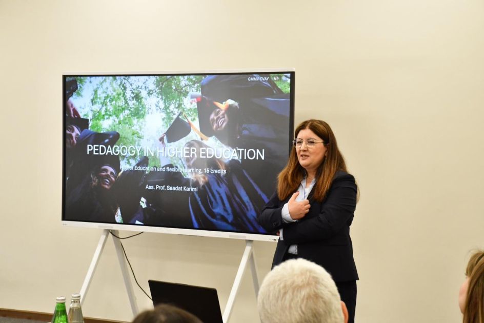 Затем профессор Саадат Керими провела семинар на тему «Педагогика высшего образования: теоретические и практические основы профессионализма преподавателя». В ходе семинара были представлены практические рекомендации, связанные с повышением эффективности обучения в вузах, внедрением педагогических инноваций, а также возможностями использования современных методов обучения преподавателями.