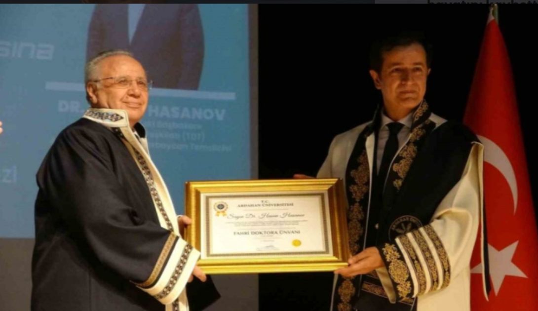 В Конгресс-центре имени Ашика Шенлика турецкого города Ардахан 22 апреля состоялась торжественная церемония вручения дипломов почетных докторов Ардаханского университета председателю Совета старейшин Организации тюркских государств (ОТГ) Бинали Йылдырыму и члену Совета старейшин ОТГ Гасану Гасанову.