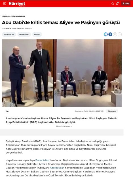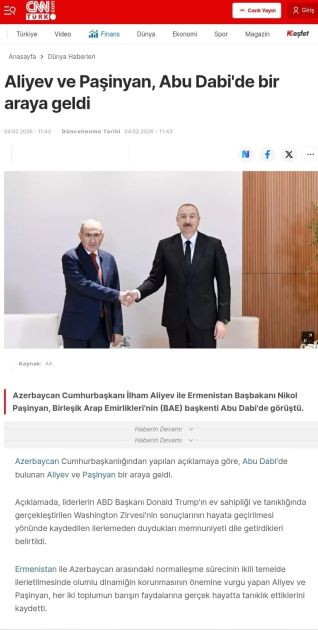 Визит Президента Азербайджана в ОАЭ и его встреча с Премьер-министром Армении получили широкое освещение и в ведущих турецких медиаструктурах, включая новостные порталы hurriyet.com.tr, akittv.com.tr, ensonhaber.com, haberturk.com, cnnturk.com. В публикациях отмечается, что стороны договорились продолжить контакты и усилия, направленные на дальнейшее укрепление мира и стабильности между Азербайджаном и Арменией, а также на поддержку процесса нормализации отношений. Сообщается также, что в ходе встречи обсуждалась реализация «Маршрута Трампа во имя международного мира и процветания» (TRIPP) и других связных проектов.