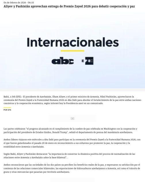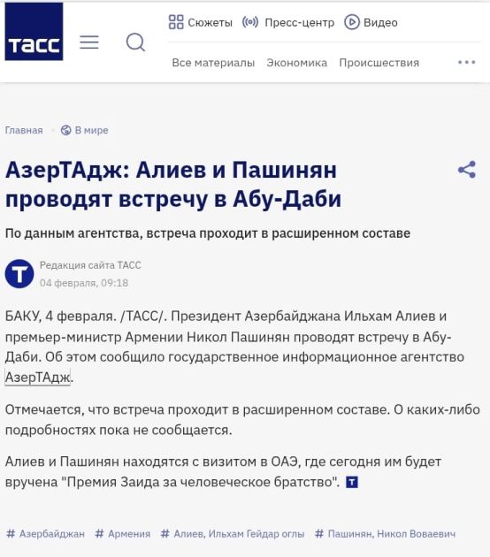 Сообщается также, что Президент Азербайджана Ильхам Алиев и Премьер-министр Армении Никол Пашинян 4 февраля приняли участие в церемонии вручения «Премии Заида за человеческое братство» за 2026 год, состоявшейся в столице Объединенных Арабских Эмиратов - Абу-Даби. В этом году награда была присуждена обоим лидерам.