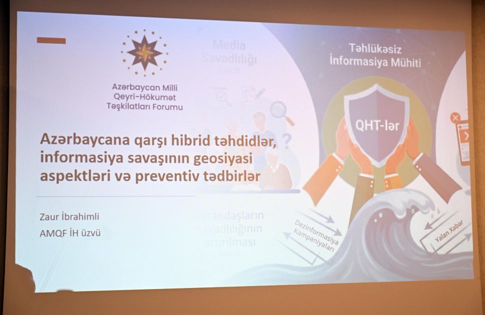 На сессии «Гибридные угрозы против Азербайджана, геополитические аспекты информационной войны и превентивные меры» член правления Национального форума неправительственных организаций Азербайджана Заур Ибрагимли и председатель Общественного объединения Центра общественных инициатив Санан Наджафов обратили внимание на расширение масштабов гибридных угроз на глобальном уровне и новые формы их проявления.