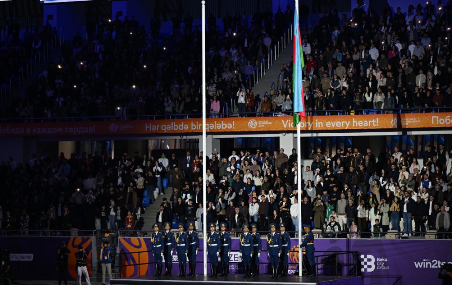 Сначала на арену был вынесен и поднят под звуки государственного гимна трехцветный флаг Азербайджанской Республики.