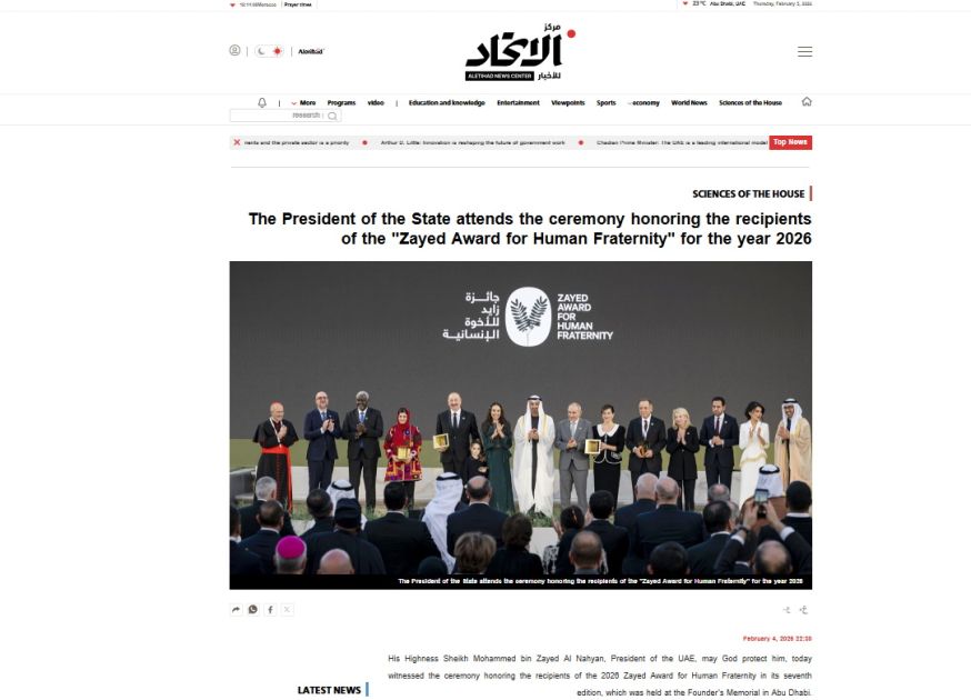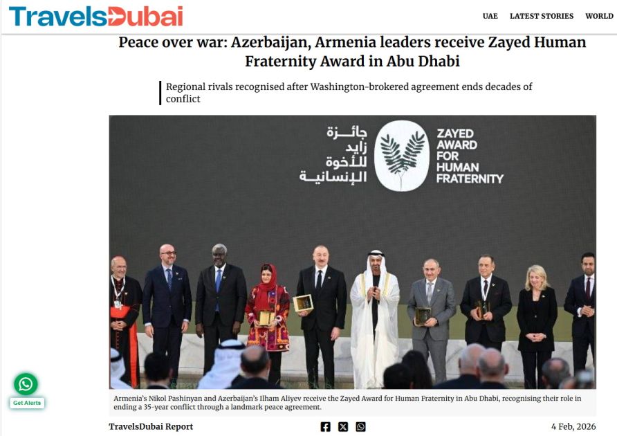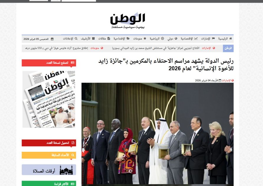 Газеты и интернет-порталы ОАЭ - Al IttihadThe Travel DubaiUAE BarqAl VatanNabd также опубликовали материалы о вручении Президенту Ильхаму Алиеву «Премии Заида за человеческое братство». В публикациях отмечается, что глава азербайджанского государства выразил глубокую признательность великому имаму университета «Аль-Азхар», доктору Ахмеду ат-Тайибу, и Папе Римскому, Его Святейшеству Льву, за их вклад в развитие межрелигиозного диалога и усилия, направленные на сближение цивилизаций. Президент также поблагодарил всех коллег, которые в своих приветственных обращениях к участникам церемонии вновь подчеркнули значение мира между Азербайджаном и Арменией.