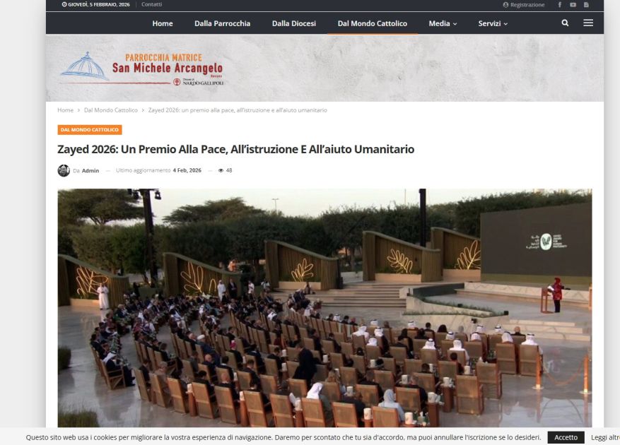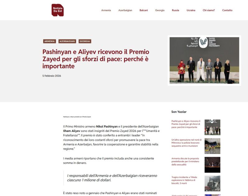 Визит Президента Азербайджана в Абу-Даби широко освещался и в авторитетных итальянских средствах массовой информации. Газеты Notizie da EstLatestataFarodiromaParroççia, а также агентство Agenzie Nova опубликовали материалы о вручении Президенту Ильхаму Алиеву «Премии Заида за человеческое братство», а также о встрече главы азербайджанского государства с Премьер-министром Армении.