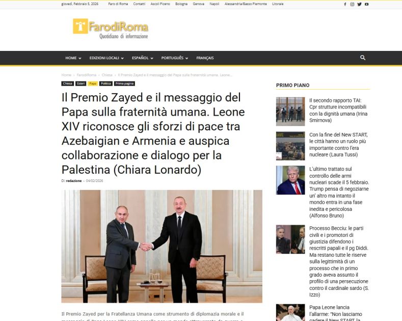 Официальное издание Ватикана Vatican News также опубликовало материал о вручении Президенту Ильхаму Алиеву «Премии Заида за человеческое братство», а также его встрече с Премьер-министром Армении.