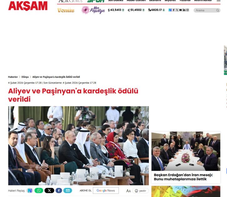 На сайтах новостного агентства İhlas и телеканала Haber Global, а также в газетах AkşamYeni AkitBirgün, на порталах Haber365HaberlerimSon dakikamHaber sitesi и других ресурсах братской страны, имеющих широкую читательскую аудиторию, были опубликованы материалы о вручении Президенту Ильхаму Алиеву «Премии Заида за человеческое братство», а также встрече главы азербайджанского государства с Премьер-министром Армении.