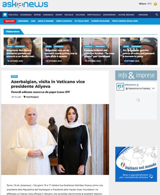 Итальянские СМИ уделили особое внимание официальному визиту Первого вице-президента Мехрибан Алиевой в Ватикан