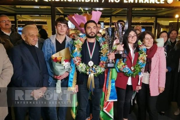 в Международном аэропорту Гейдар Алиев наших шахматистов- чемпионов мира среди юниоров,встречали члены их семей, официальные лица Федерации шахмат АР и представители СМИ