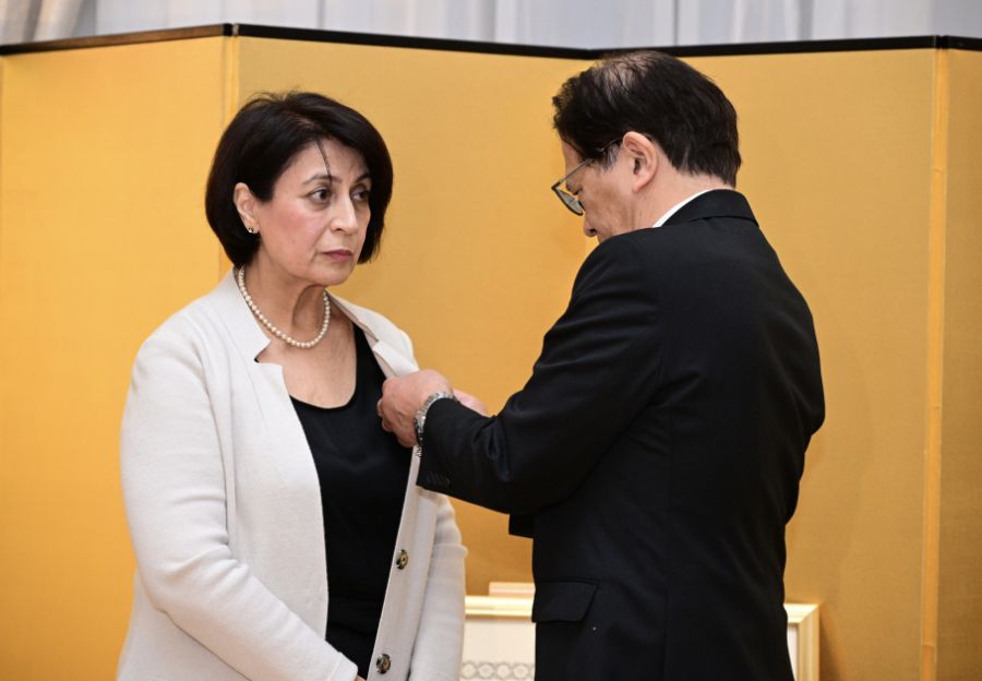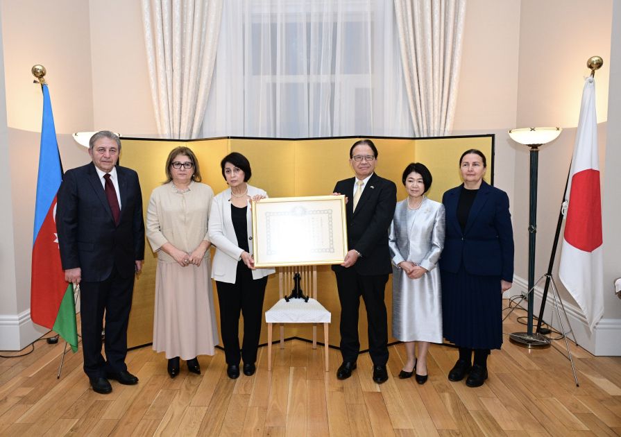 В резиденции посла Японии в Баку состоялась церемония вручения азербайджанскому преподавателю японского языка Эсмире Мамедовой «Ордена Восходящего солнца с серебряными лучами».