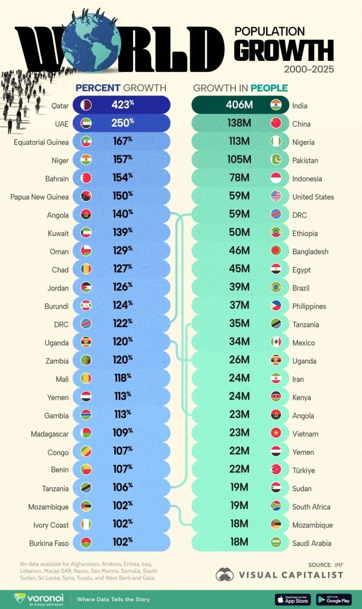 Новая инфографика сопоставляет государства с самыми высокими темпами прироста населения за указанный период — как в процентном выражении, так и по абсолютному числу добавившихся жителей — на основе данных Международного валютного фонда.
