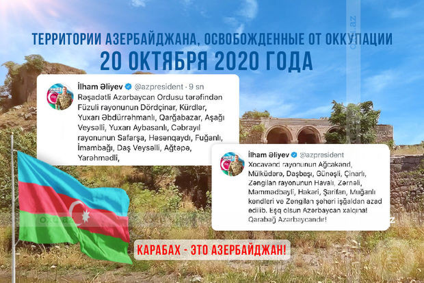 Oxu.Az напоминает, что 20 октября 2020 года азербайджанская армия освободила от врага села Дердчинар, Кюрдлер, Юхары Абдуррахманлы, Гаргабазар, Ашагы Вейселли, Юхары Айбасанлы Физулинского района, Сафарша, Гасангайды, Фуганлы, Имамбагы, Даш Вейселли, Агтепе, Ярахмедли - Джебраильского, Агджакенд, Мюлкюдере, Дашбаши, Гюнешли, Чинарлы - Ходжавендского, Хавалы, Мамедбейли, Шерифан, Муганлы и поселок Хакари Зангиланского районов, а также сам город Зангилан.