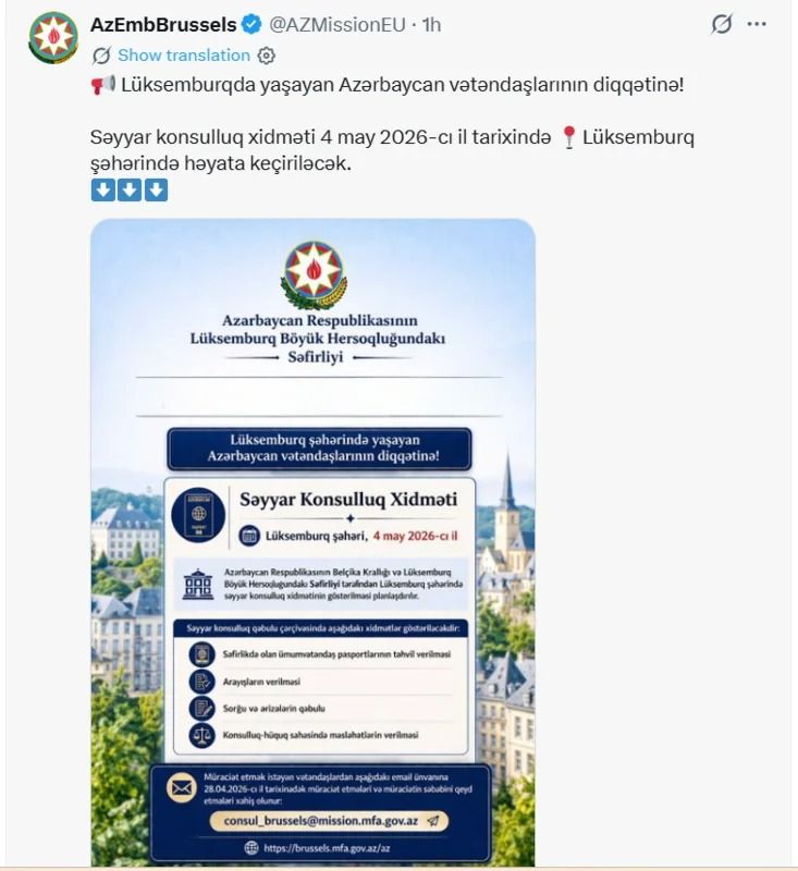 Кроме того, 4 мая будут организованы выездные консульские услуги для граждан Азербайджана, проживающих в Люксембурге. Соответствующей информацией посольство Азербайджана в Бельгии поделилось на своей странице в соцсети Х.