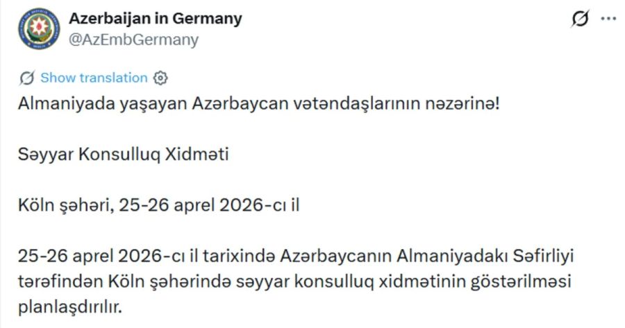 "25-26 апреля 2026 года посольством Азербайджана в Германии планируется предоставление выездных консульских услуг в городе Кёльне", - отмечается в сообщении.