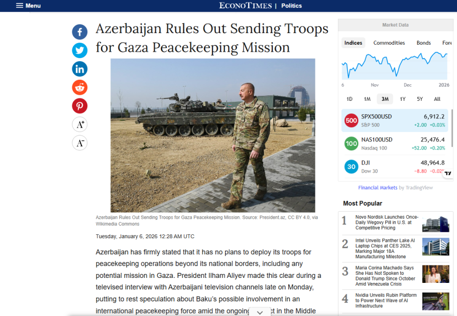 Международный экономический портал Investing.com, израильские газеты The Jerusalem Post, Israelhayom, Time of Israel, русскоязычный портал «Вести Израиль», болгарское издание Dnevnik и греческий интернет-ресурс Skai также опубликовали мысли Президента Азербайджана о конфликтах на Ближнем Востоке. В материалах отмечалось, что Президент Ильхам Алиев опроверг неверную информацию об отправке миротворцев в сектор Газа и направил обращение из 20 вопросов американской стороне, первому источнику этих новостей, по дипломатическим каналам, а также выразил сожаление по этому поводу.