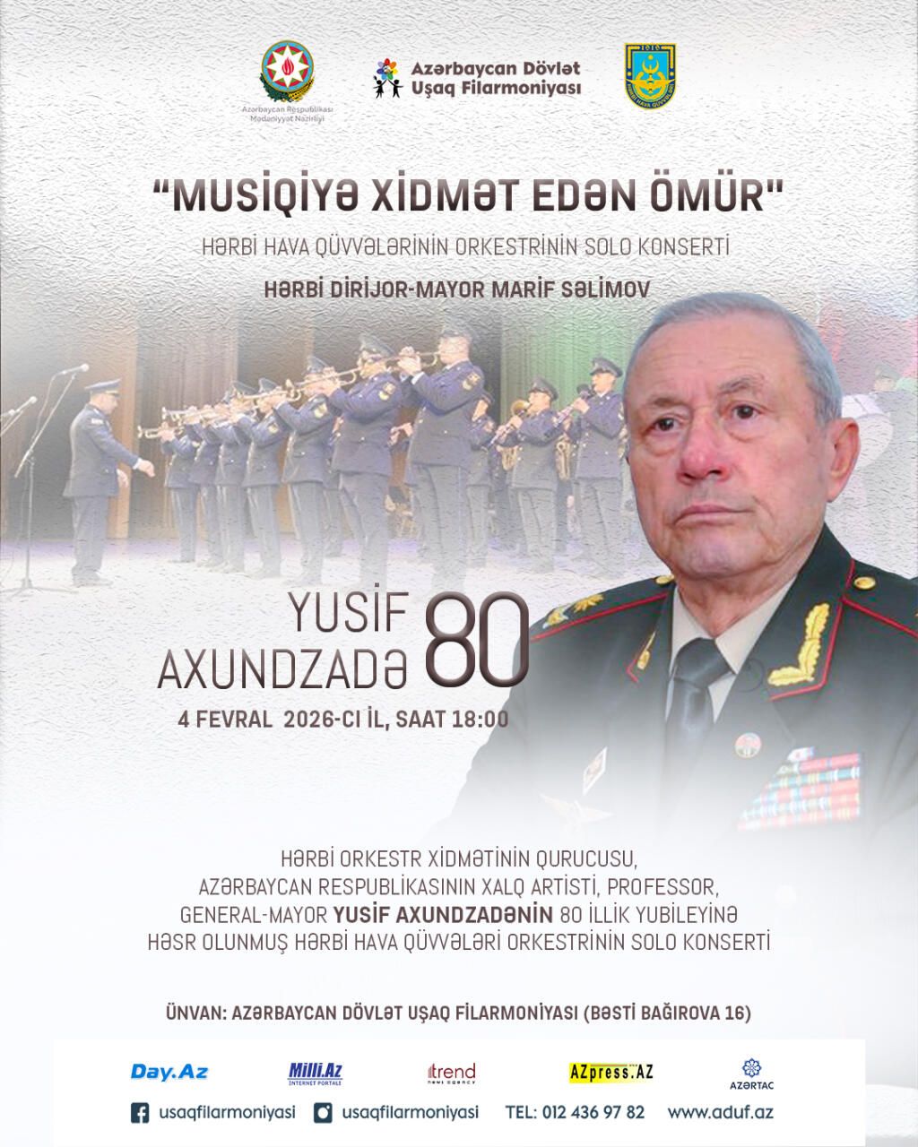 В Азербайджанской государственной детской филармонии был отмечен 80-летний юбилей видного представителя азербайджанского музыкального и военно-оркестрового искусства, генерал-майора, профессора, народного артиста Юсифа Ахундзаде, сообщает Day.Az.