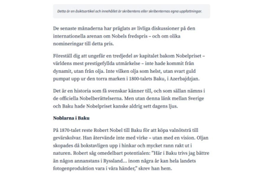 В издании Karlskoga Tidning-Kuriren опубликована статья о вкладе бакинской нефти в Нобелевскую премию