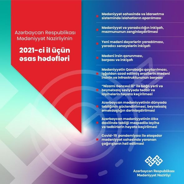 Министерство культуры Азербайджана объявило основные цели на 2021 год, направленные на сохранение, развитие, обогащение и передачу следующему поколению богатой культуры и материально-духовного наследия нашего народа, пропаганды его во всем мире, а также эффективную реализацию государственной политики в данной области.