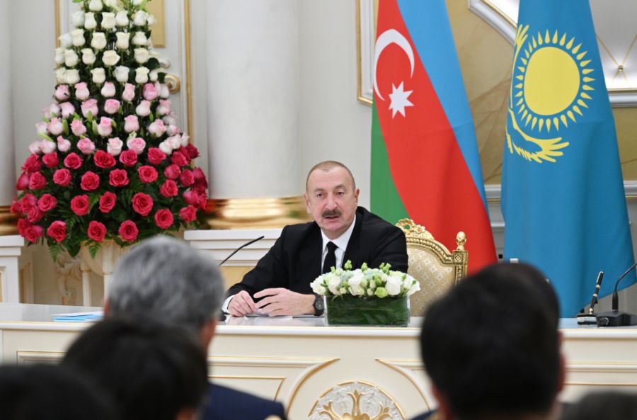 Прежде всего, выражаю искреннюю признательность уважаемому Президенту Ильхаму Гейдар оглу Алиеву за то, что принял мое приглашение и посетил Казахстан с государственным визитом.