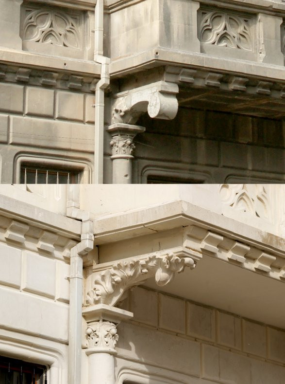 Понятно, что фасады здешних построек за более чем полуторавековую историю выглядели не очень привлекательно. Как и другие стены, фасадная часть домов была покрыта слоем копоти, в облицовочном камне зияли трещины, многие декоративные детали из резного камня отвалились, как и литые кронштейны балконов. К тому же во многих местах в стены зданий были вбиты металлические крепления для троллейбусных линий, высоковольтных кабелей, телефонной связи и др.