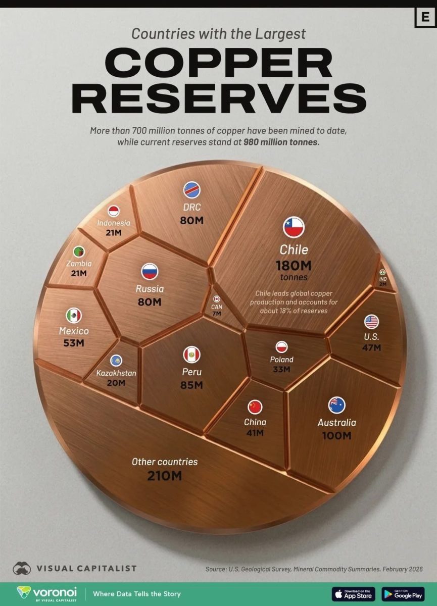 Новая инфографика, основанная на данных Геологической службы США за 2026 год, показывает распределение мировых запасов меди по странам и наглядно демонстрирует, насколько они сконцентрированы.