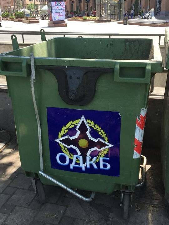 По всему Еревану на мусорных баках наклеен логотип Организации Договора о коллективной безопасности (ОДКБ).