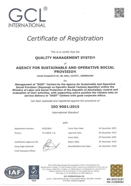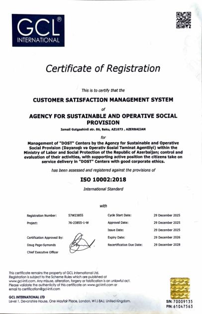 Агентство устойчивого и оперативного социального обеспечения (DOST) в подчинении Министерства труда и социальной защиты населения удостоено сертификатов ISO по трем направлениям.