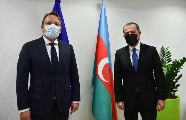 После встречи министров иностранных дел стран Восточного партнерства министр Джейхун Байрамов встретился с комиссаром Европейского Союза по вопросам расширения и политики соседства Оливером Вархели.