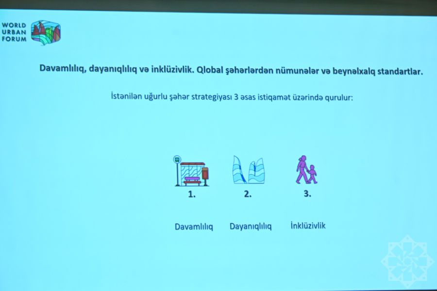 В продолжение сессии представителями Операционной компании «WUF13 Азербайджан» и Государственного комитета градостроительства и архитектуры участникам была предоставлена подробная информация по вопросам устойчивости и инклюзивности, а также о сути Всемирного форума городов, развитии градостроительства и политике устойчивости Азербайджана, а также об Азербайджанской градостроительной кампании, реализуемой в рамках WUF13. Было проведено практическое занятие, охватывающее наиболее важные и актуальные вопросы в сфере градостроительства.