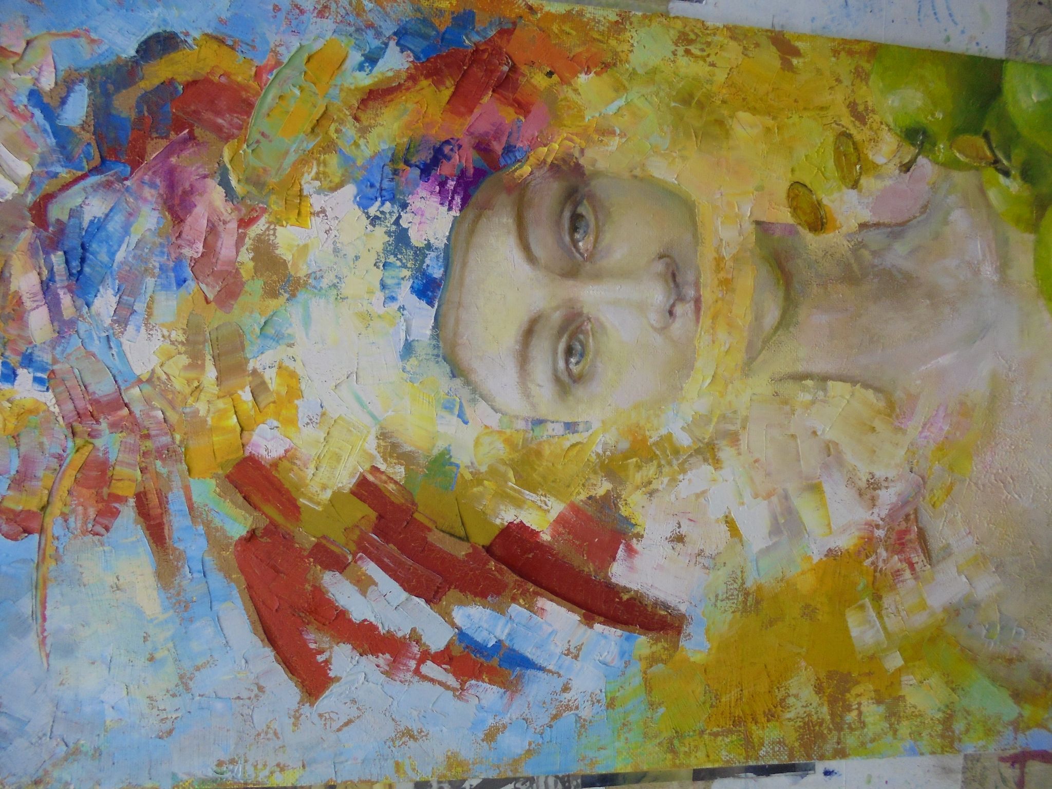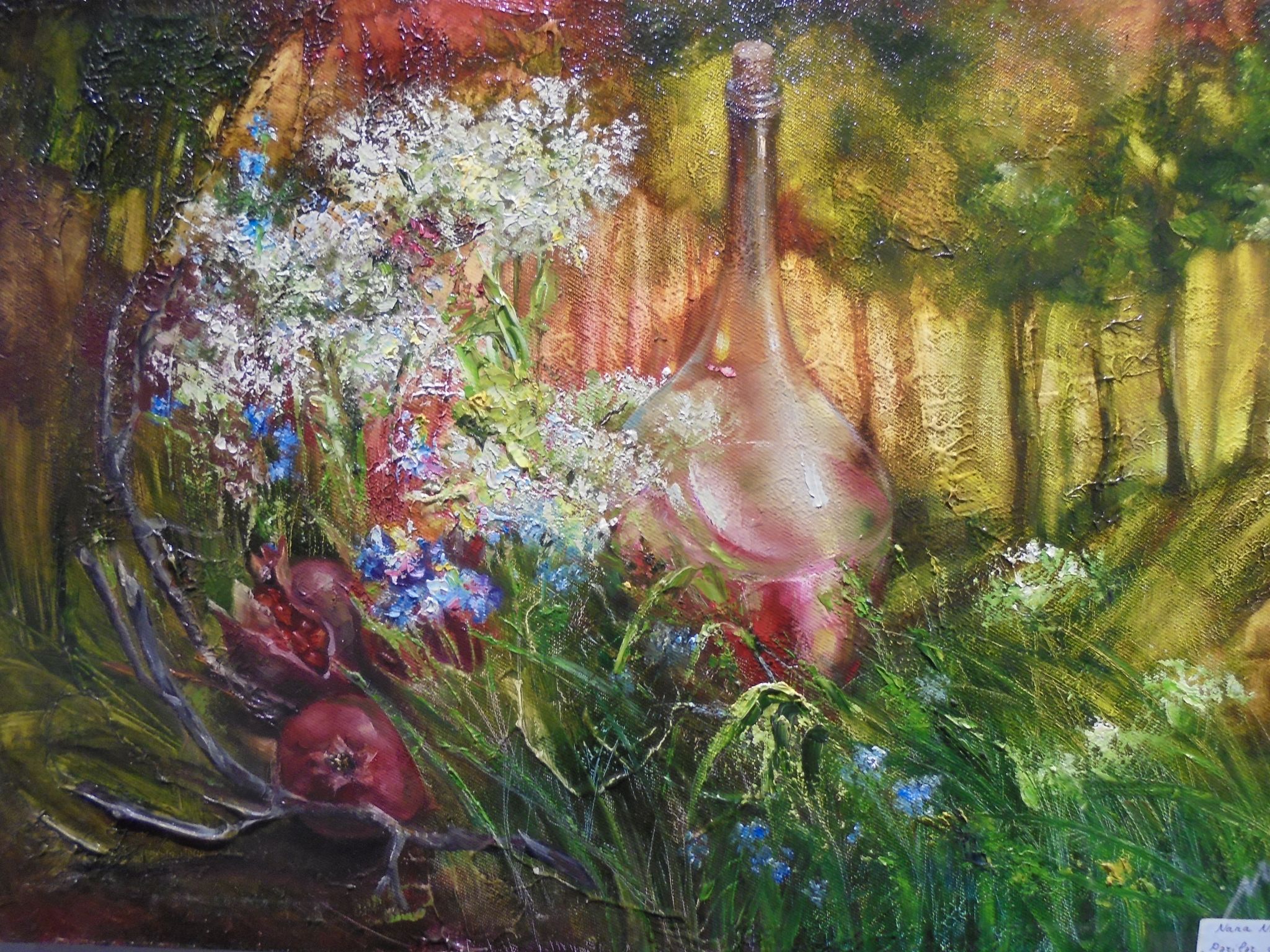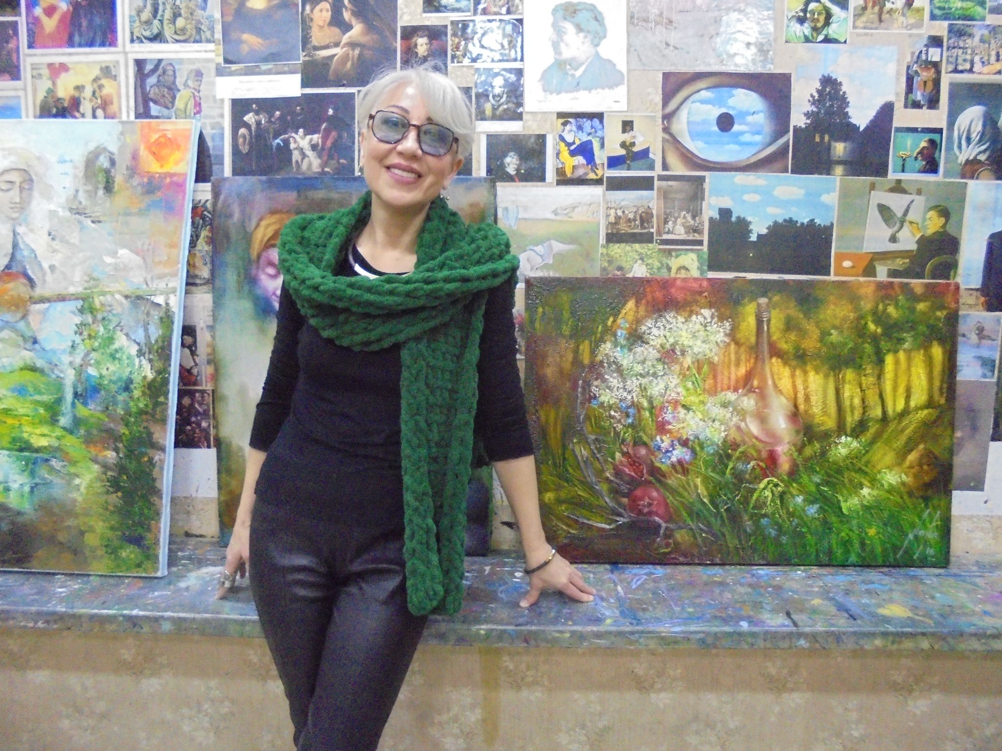 Мастерская художника Наны Нириманбейли оформлена с таким вкусом, что здесь охотно проводят занятия ее ученики и дочери – преподавателя испанского языка. Ряд работ Наны недавно выставлялись в выставочном зале Союза художников. Они не принадлежат к тем, мимо которых можно пройти, скользнув взглядом. Каждая ее картина требует концентрации внимания, требует разгадки затаившихся символов и кодов.