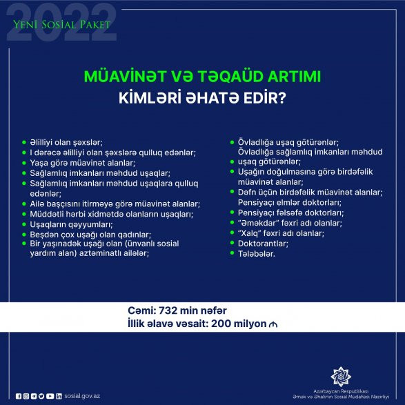 «Подписанные президентом Ильхамом Алиевым новые распоряжения являются успешным продолжением широкомасштабных реформ, направленных на повышение социальных выплат уязвимым группам населения», - говорится в сообщении ведомства.